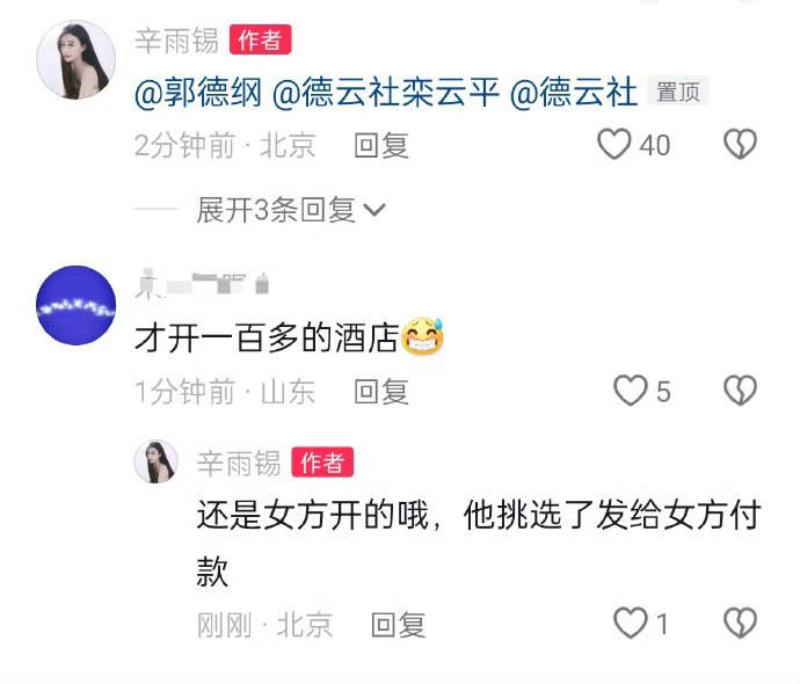 另外,還連同辛雨錫一同聯合力證秦霄賢出軌:包括曬出了2019年10月22—25日,兩人每天156元的開房記錄。