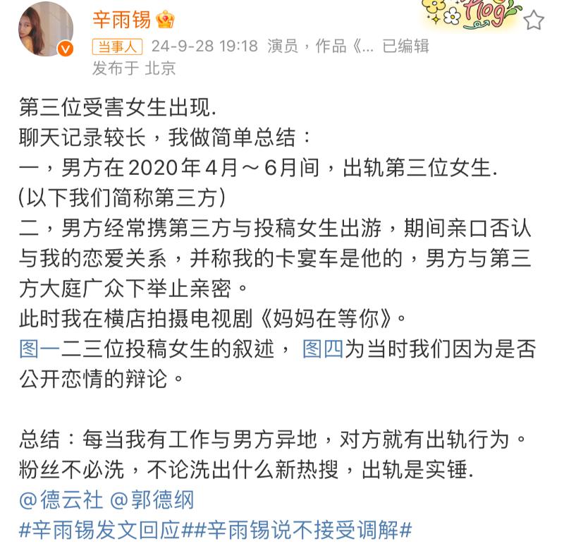 辛雨錫再曝秦霄賢出軌的第三位受害女生,她發文稱:「男方在2020年4月~6月間,出軌第三位女生(簡稱第三方)。男方經常攜第三方與投稿女生出遊,期間親口否認與我的戀愛關系,並稱我的卡宴車是他的,男方與第三方大庭廣衆下舉止親密。」並表示:「每當我有工作與男方異地,對方就有出軌行為。」
