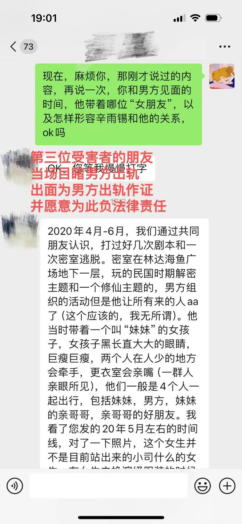 辛雨錫再曝秦霄賢出軌的第三位受害女生,她發文稱:「男方在2020年4月~6月間,出軌第三位女生(簡稱第三方)。男方經常攜第三方與投稿女生出遊,期間親口否認與我的戀愛關系,並稱我的卡宴車是他的,男方與第三方大庭廣衆下舉止親密。」並表示:「每當我有工作與男方異地,對方就有出軌行為。」