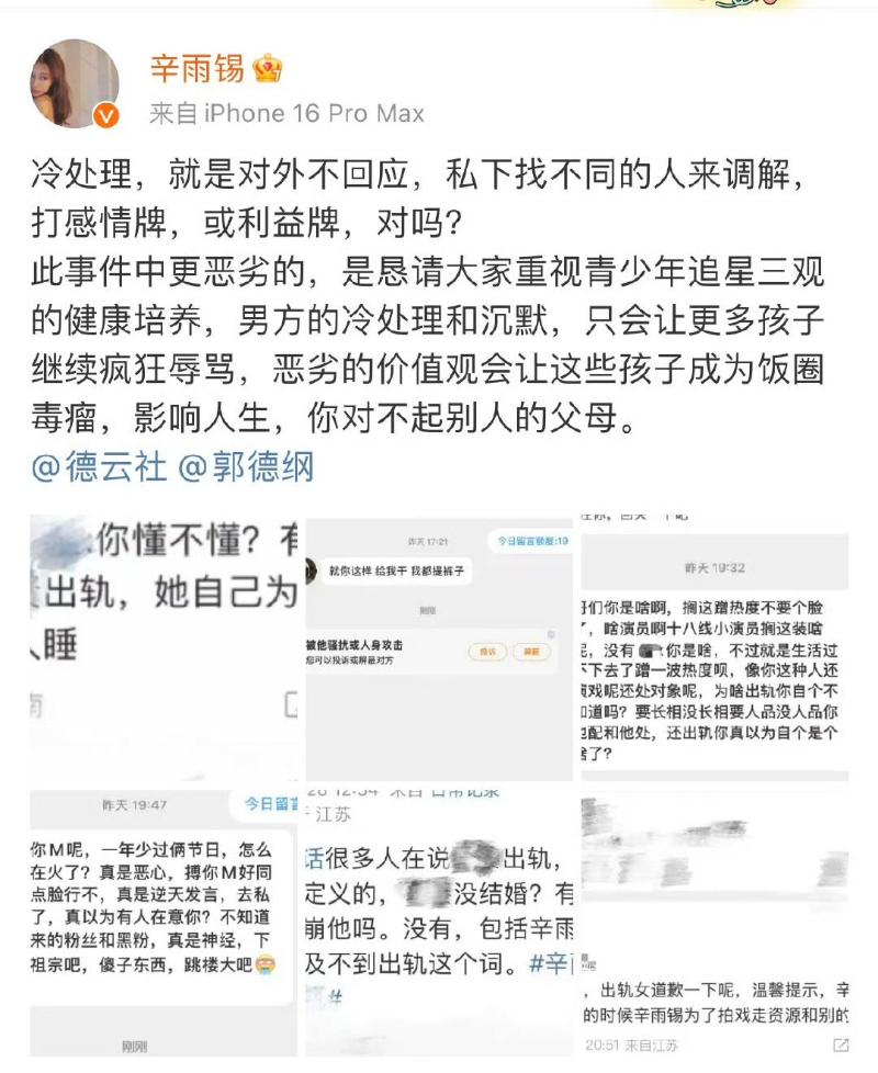 辛雨錫也強調自己不接受調解:「冷處理,就是對外不回應,私下找不同的人來調解,打感情牌,或利益牌,對嗎?此事件中更惡劣的,是懇請大家重視青少年追星三觀的健康培養,男方的冷處理和沈默,只會讓更多孩子繼續瘋狂辱罵,惡劣的價值觀會讓這些孩子成為飯圈毒瘤,影響人生,你對不起別人的父母。」