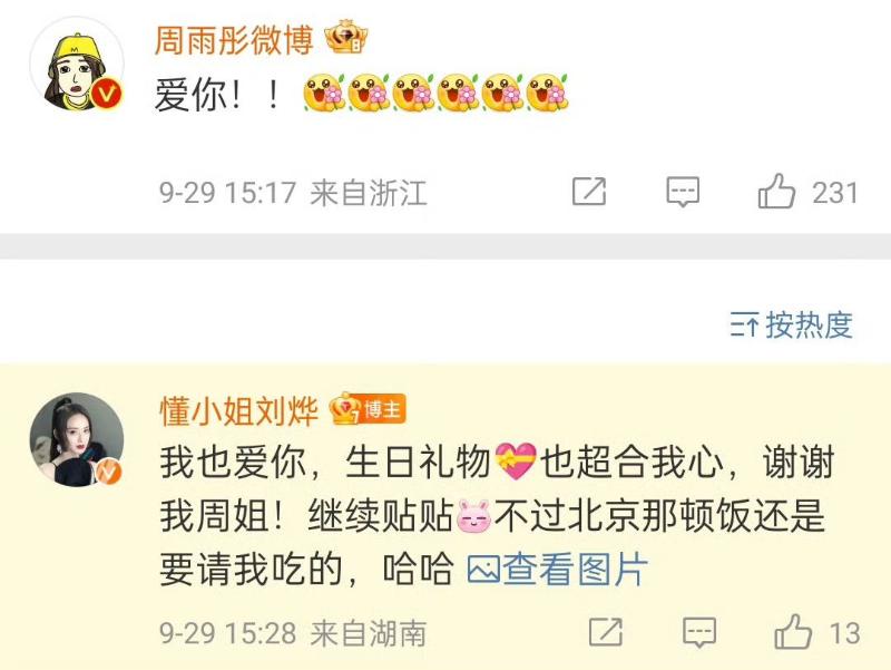 隨著熱議,周雨彤和劉燁發博互動,劉烨說:「下次我拉拉你,哈哈哈哈」
