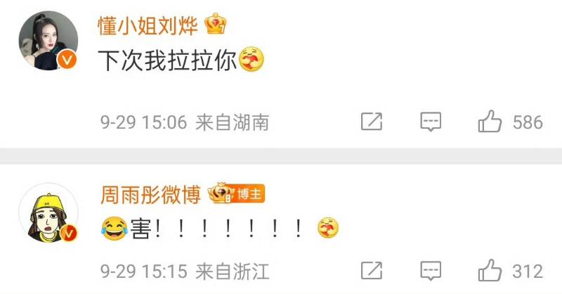 隨著熱議,周雨彤和劉燁發博互動,劉烨說:「下次我拉拉你,哈哈哈哈」