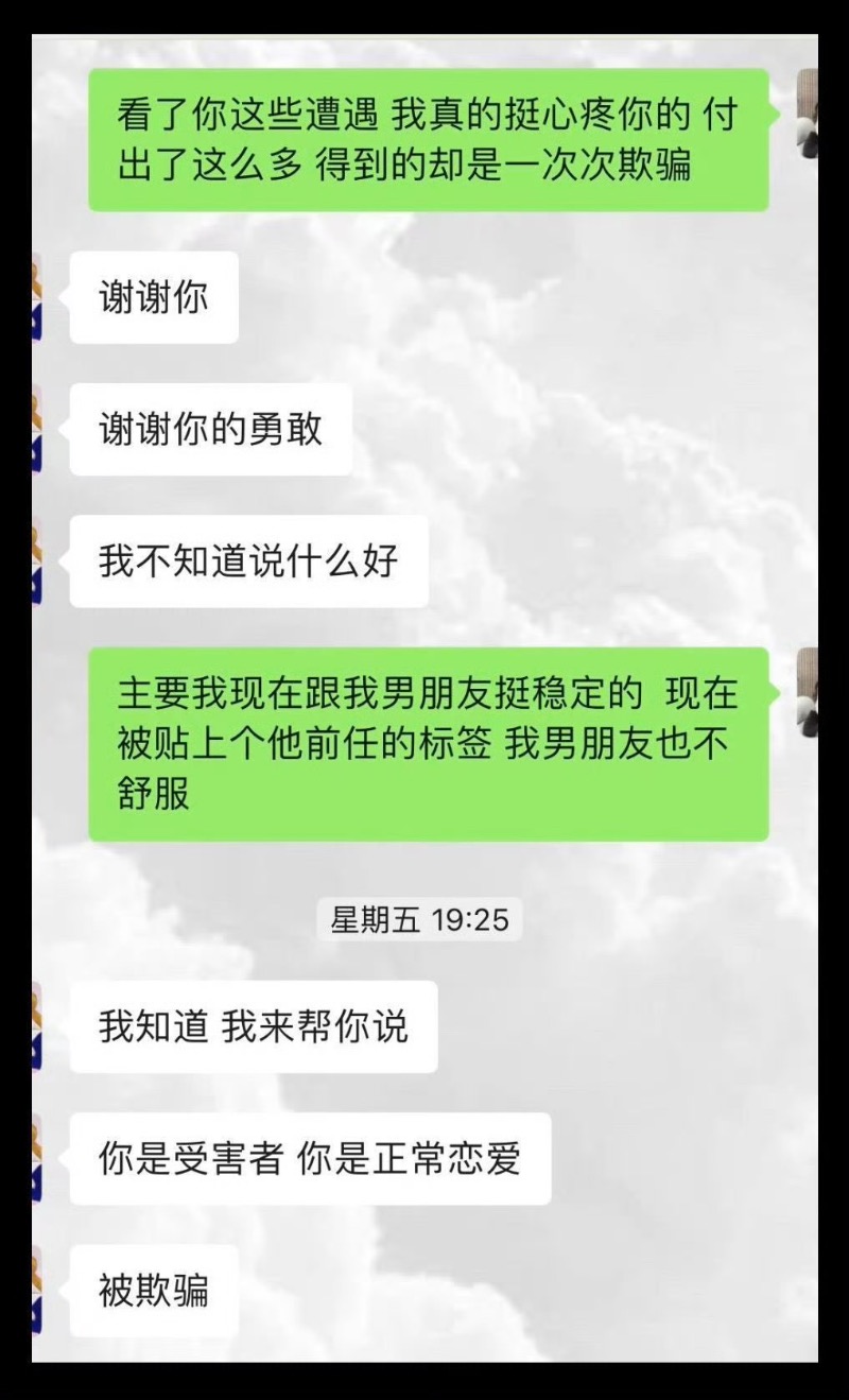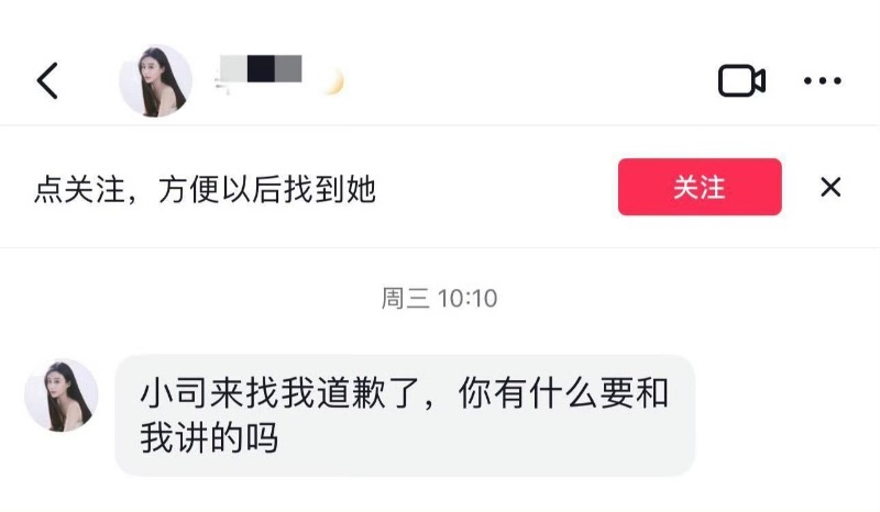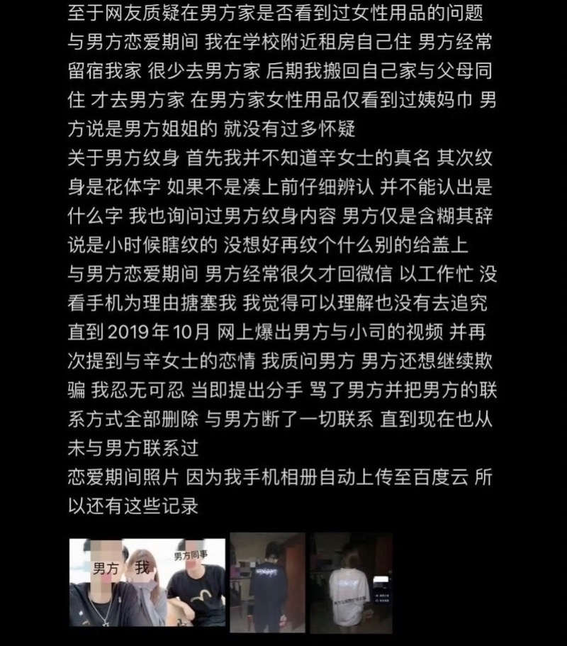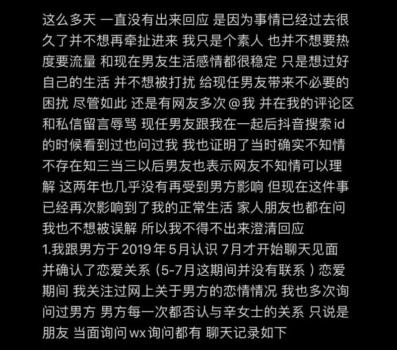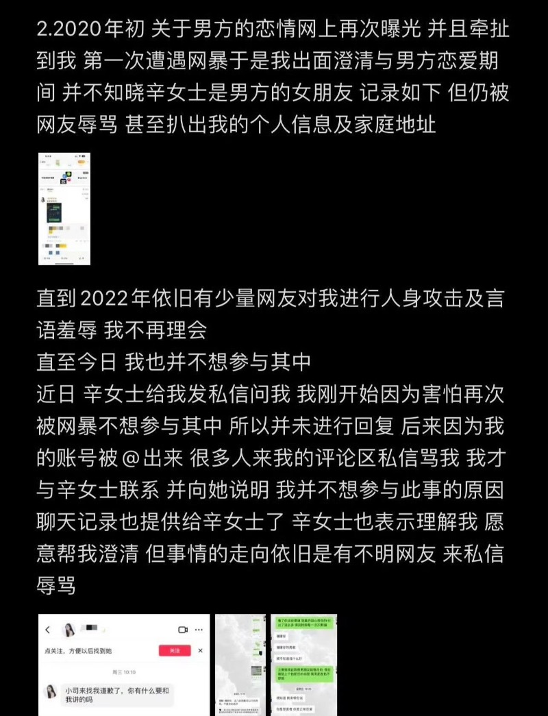 她表示自己多次被男方哄騙,與男方情感並不長久,只是被噁心到。但也向辛女士這麼多年的遭遇表達了歉意,也同情辛女士。