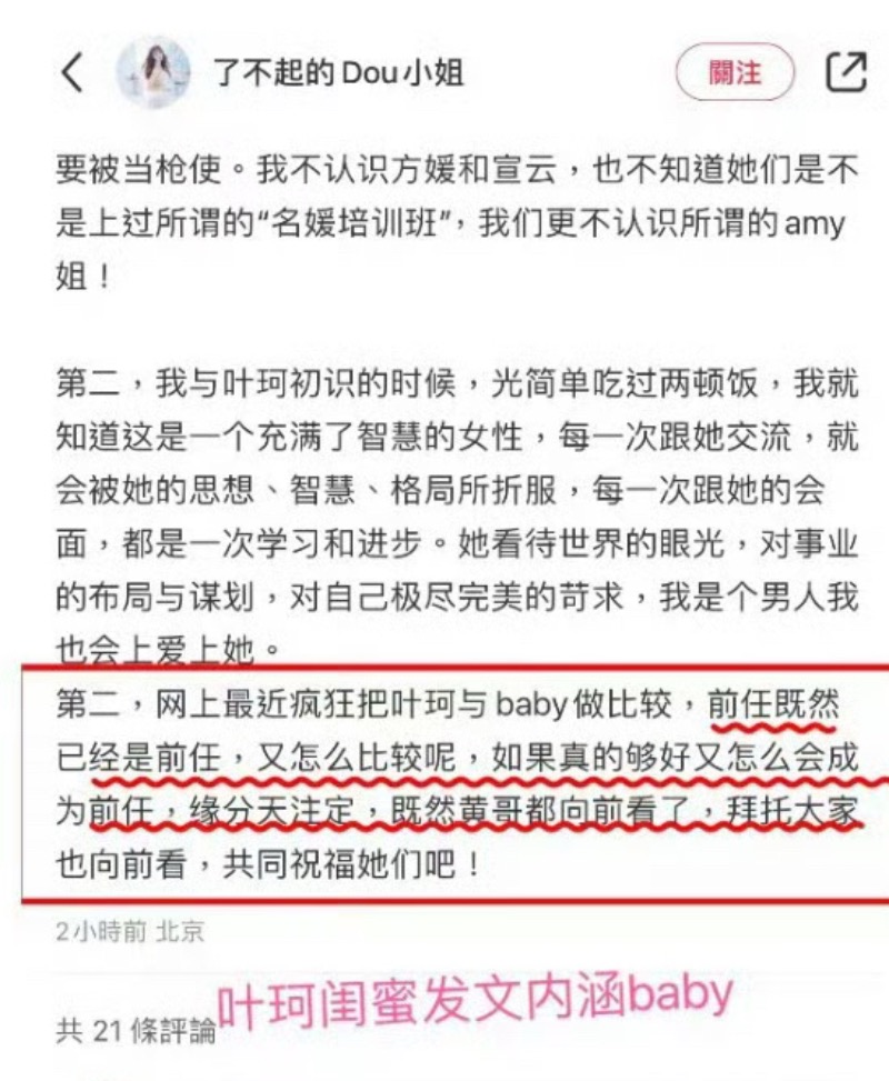 這位閨蜜一開始寫的是:「網路上最近瘋狂把葉珂與baby 做比較,既然已經是前任,又怎麼比較呢,如果真的夠好又怎麼會成為前任,緣分天注定,既然黃哥都向前看了,拜託大家也向前看,共同祝福她們吧!」