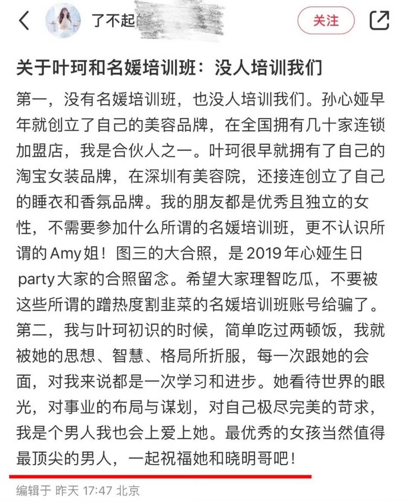 隨後葉珂被曝出曾參加「名媛訓練班」,本人沒有出來回應,但閨蜜團來了!是達,隨著越來越多熱議,葉珂閨蜜發文否認有“名媛培訓班”,說孫心婭早年就創立了自己的美容品牌、在全國有幾十家連鎖加盟店、自己也是合夥人之一;葉珂很早就有自己的淘寶女裝品牌,在深圳有美容院,也創立了自己的睡衣和香氛品牌,自己的朋友都是優秀且獨立的女性,不需要參加「名媛培訓班」也不認識所謂的Amy姊姊。