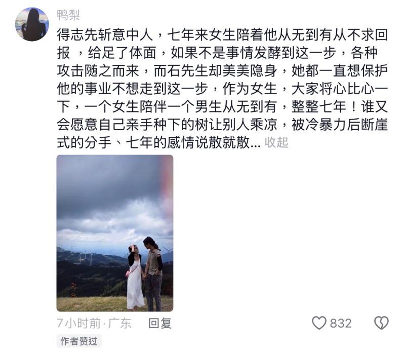 後來有疑似女方朋友,在評論區公開了女方和石凱的合照,並砲轟男方冷暴力斷崖式分手👇