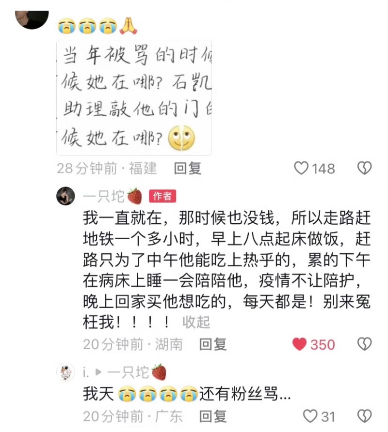隨後有粉絲留言質問,石凱這一路走來波折時,她在哪裡?女方直接回應自己一直都在,分享了自己如何陪他度過這幾年,也錘了說的就是石凱!