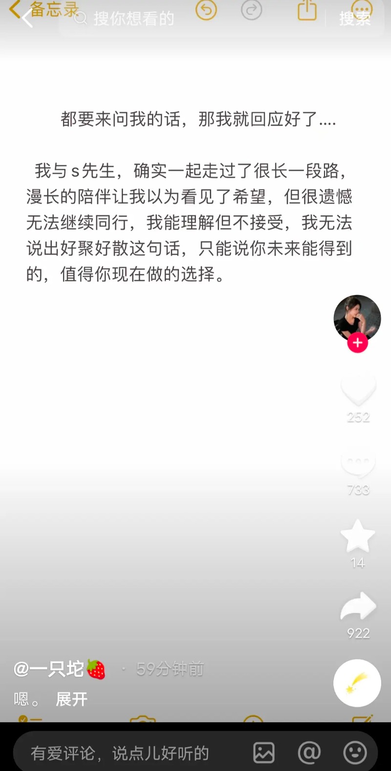 原以為是造謠跑路,不過隨後網友扒出疑似當事女方的帳號,並發聲回應,表示自己和S先生確實談了一段很長時間,無法說出好聚好散,全文如下👇