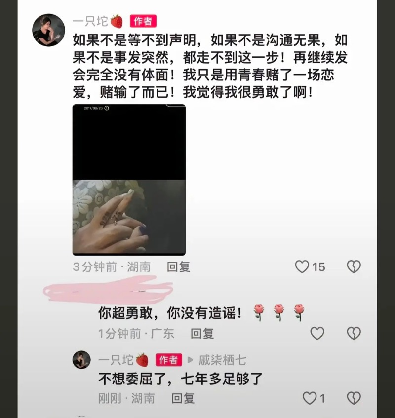 隨後評論區補充在一起7年多,不想再委屈了,並曬出了有兩人紋身的牽手照👇