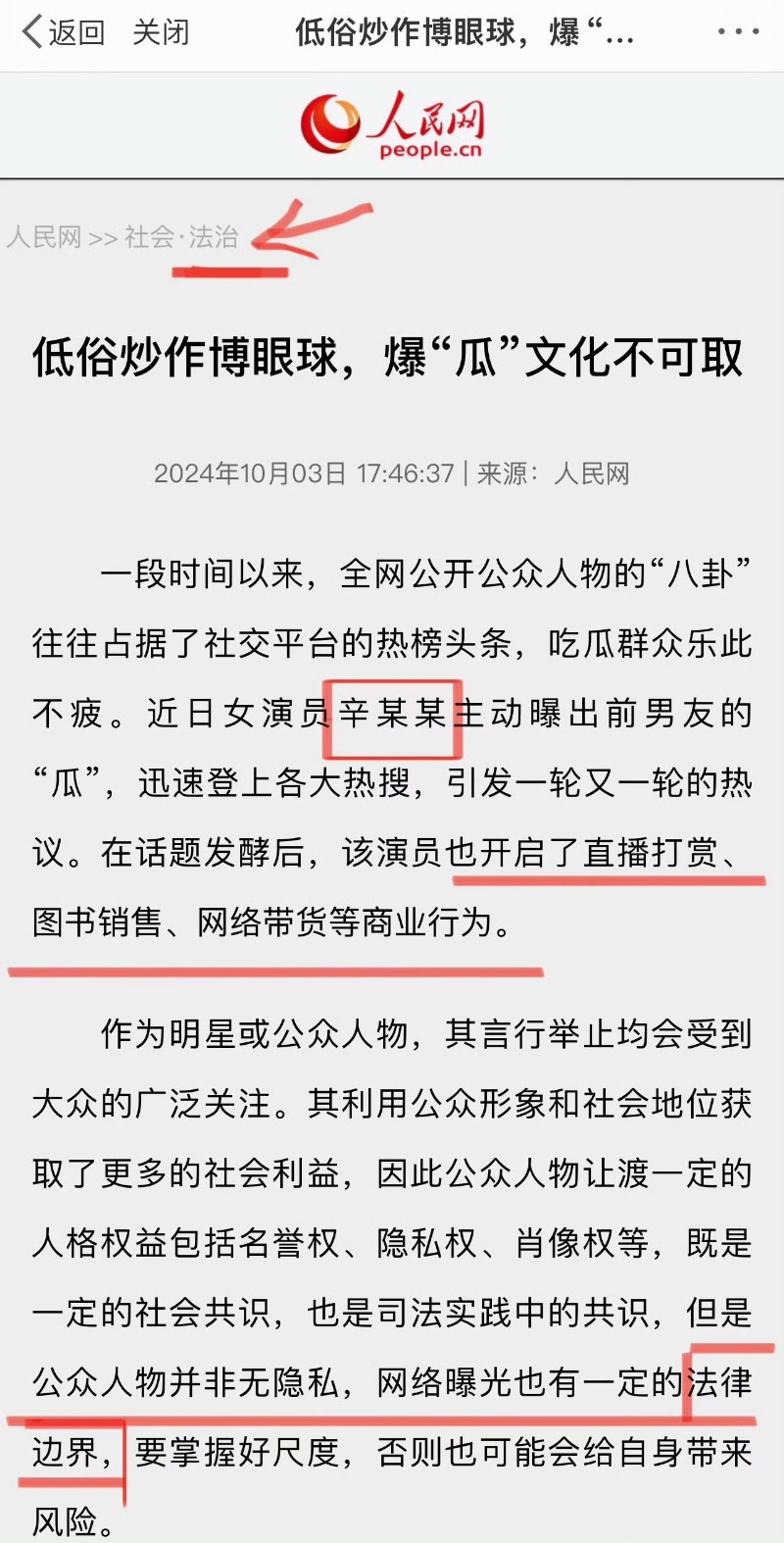 長文中指出辛雨錫“爆瓜前男友”引發熱議,話題發酵之後開啟直播打賞,圖書銷售,網絡賣貨等商業行為,利用公眾形象和社會地位獲取更多利益。