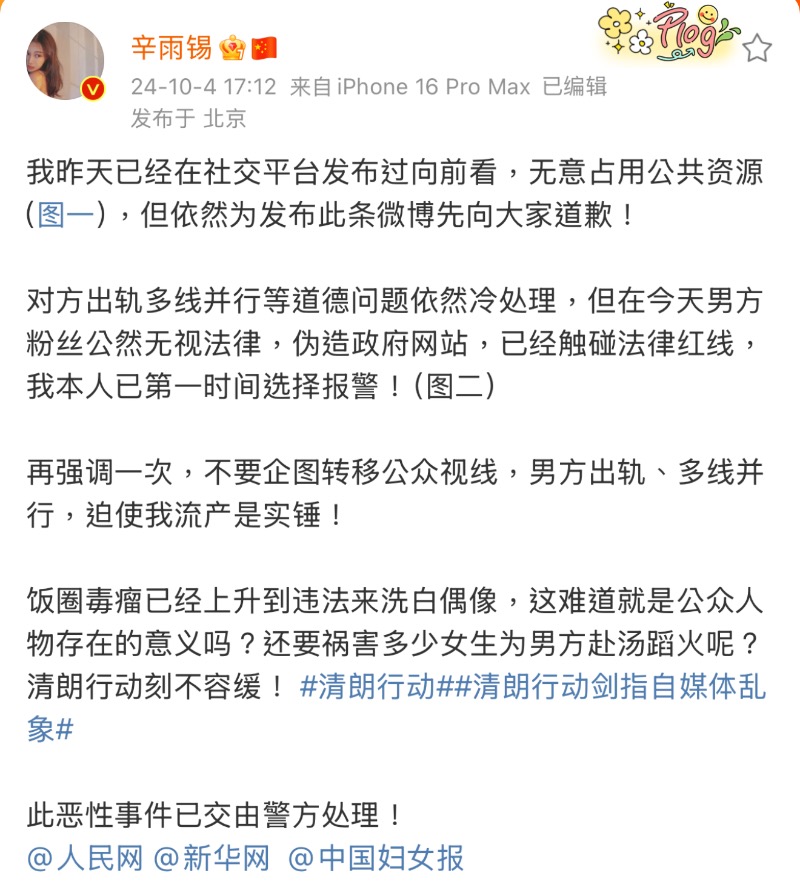 另外,辛雨錫也再次強調:「對方出軌多線並行等道德問題依然冷處理,但在今天男方粉絲公然無視法律,偽造政府網站,已經觸碰法律紅線,我本人​​已第一時間選擇報案!」還表示:「男方出軌、多線並行,迫使我流產是實錘!」