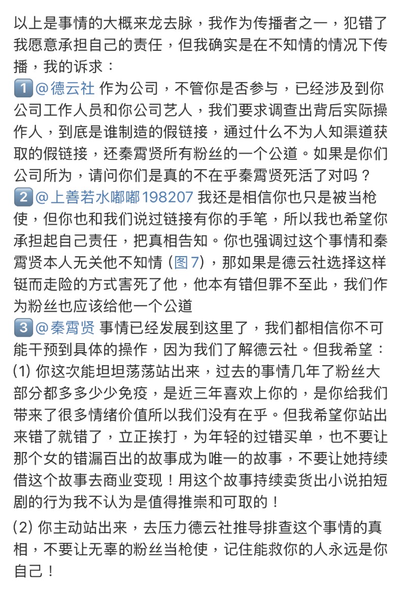 對德雲社和秦霄賢提出訴求,要求他們出來回應,不要再把粉絲當槍使👇
