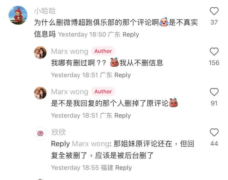 隨後這則評論消失,但前夫回復表示自己從不刪除信息,其他網友則幫忙澄清,表示應該是後台刪除👇