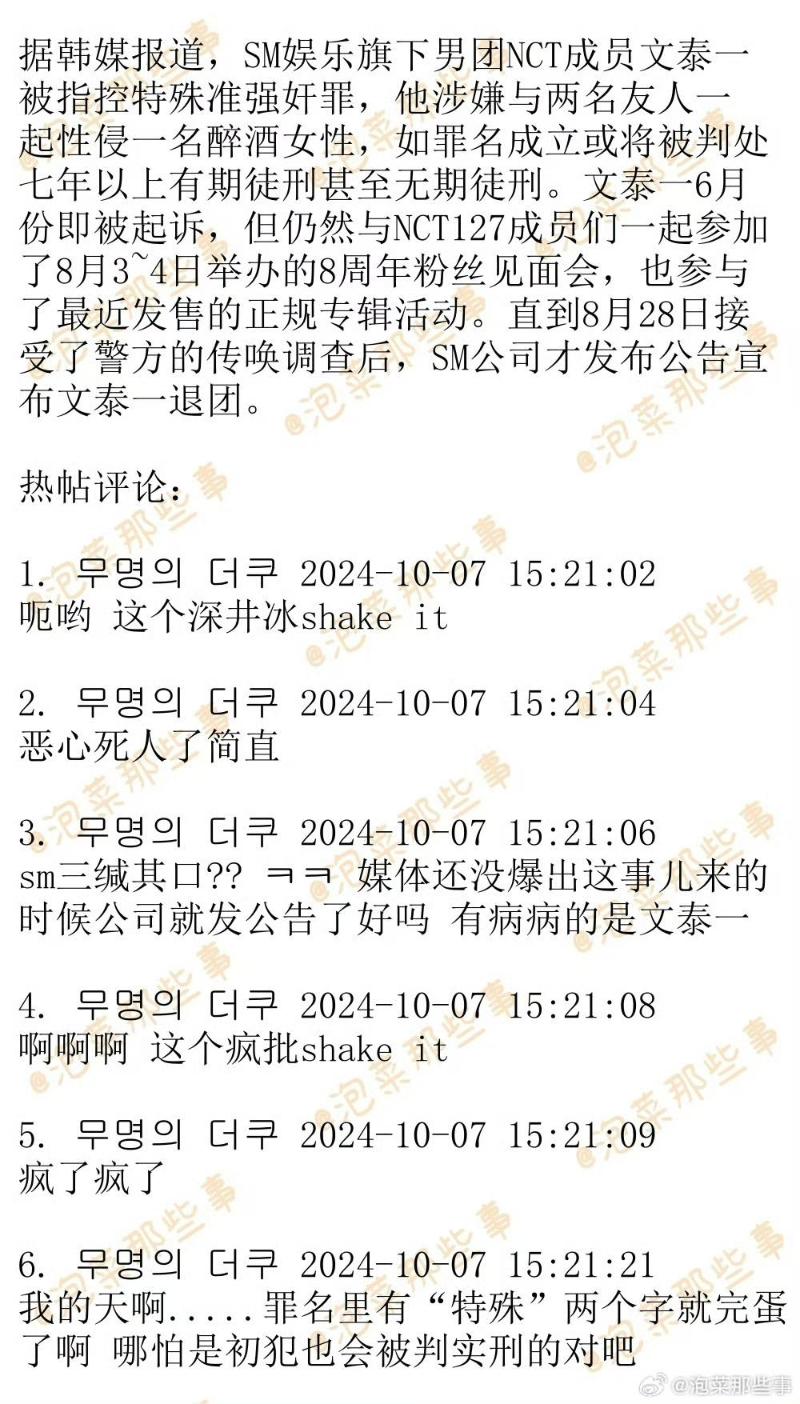 是噠,前NCT成員文泰一在8月底被爆出涉及性犯罪,相關細節一直到7號才有了後續進展,韓媒報導表示文泰一因涉嫌與兩名熟人一起對醉酒女性實施性暴力,于今年6月被起訴。