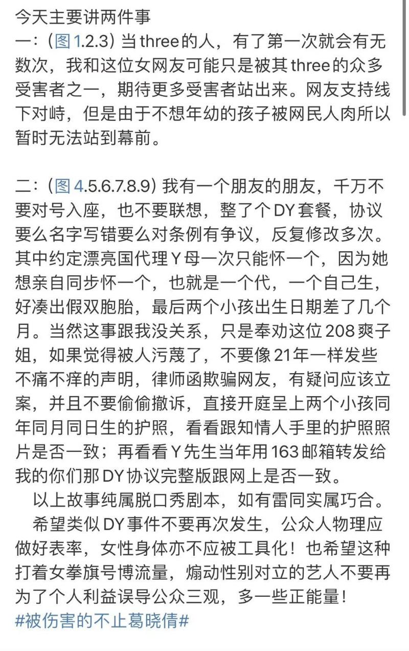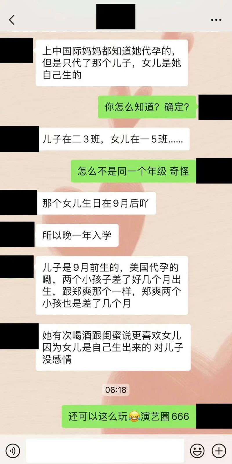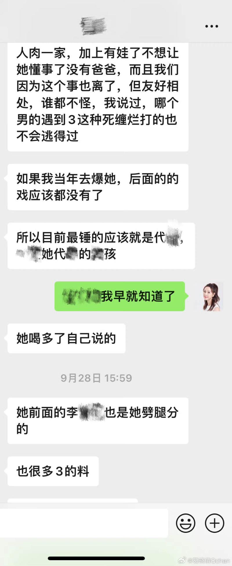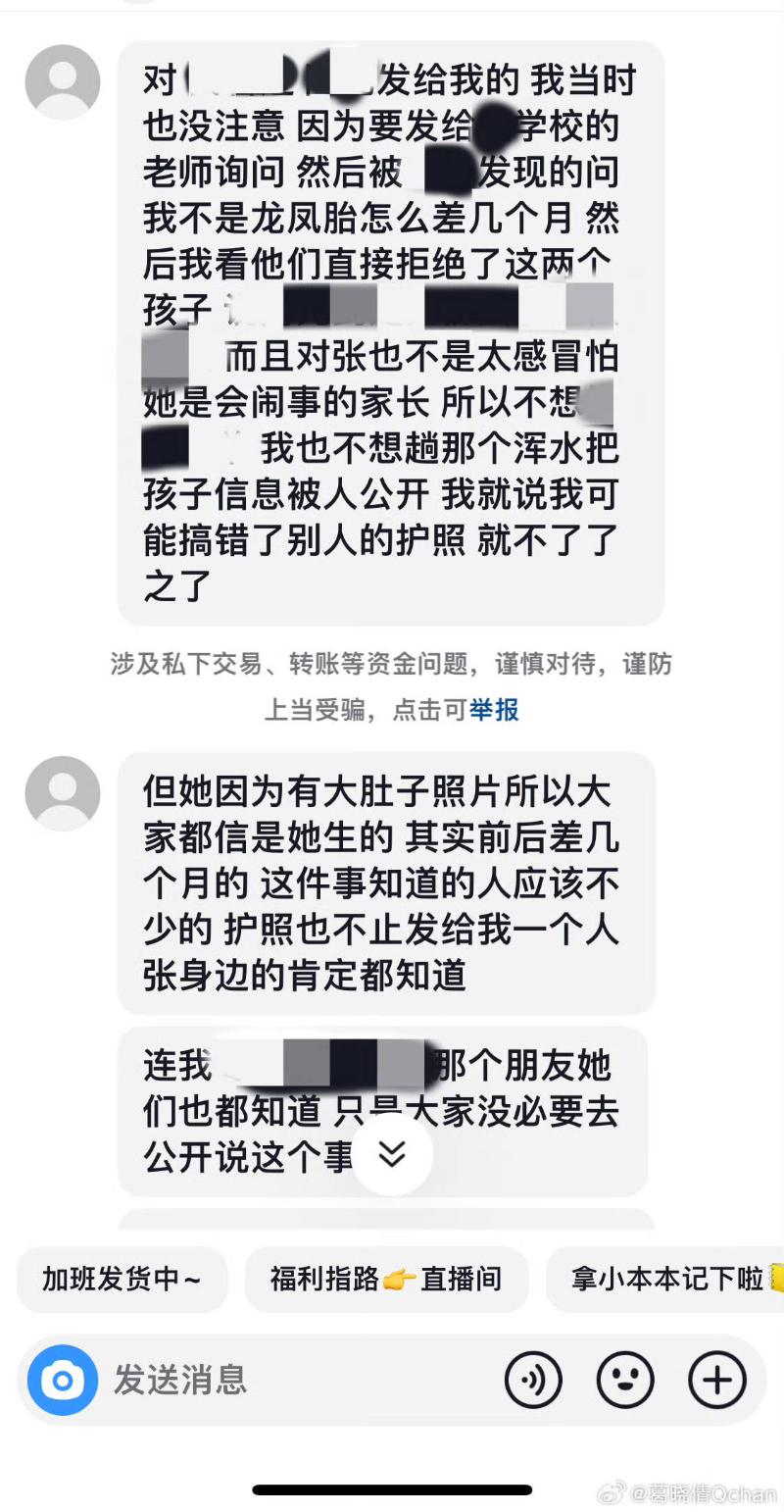 葛小倩曬出跟張雨绮前男友的女友聊天記錄,記錄顯示這位女士也是被張雨绮插足,還說某208爽子姐(張雨绮原名張爽)雙胞胎其中一個是代孕,並曬出代孕證據。