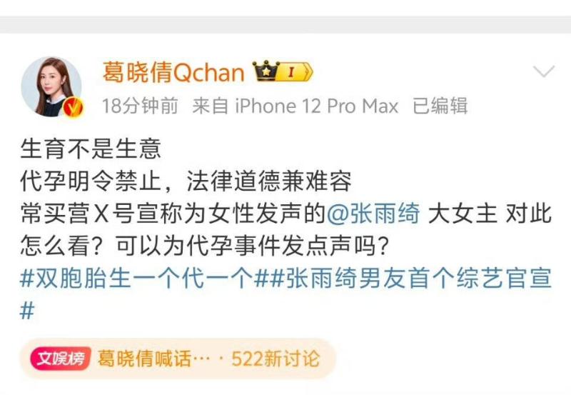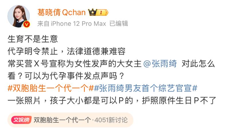 但隨著熱議,葛曉倩又再次發文,直接艾特了張雨绮出來交代有關代孕一事。