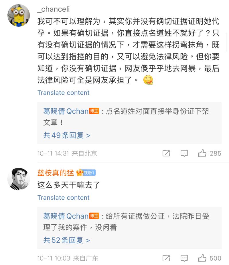 葛曉倩在評論區回復網友,表示所有證據做了公證,不能直接點名道姓,是因為對方會舉身份證下架文章!