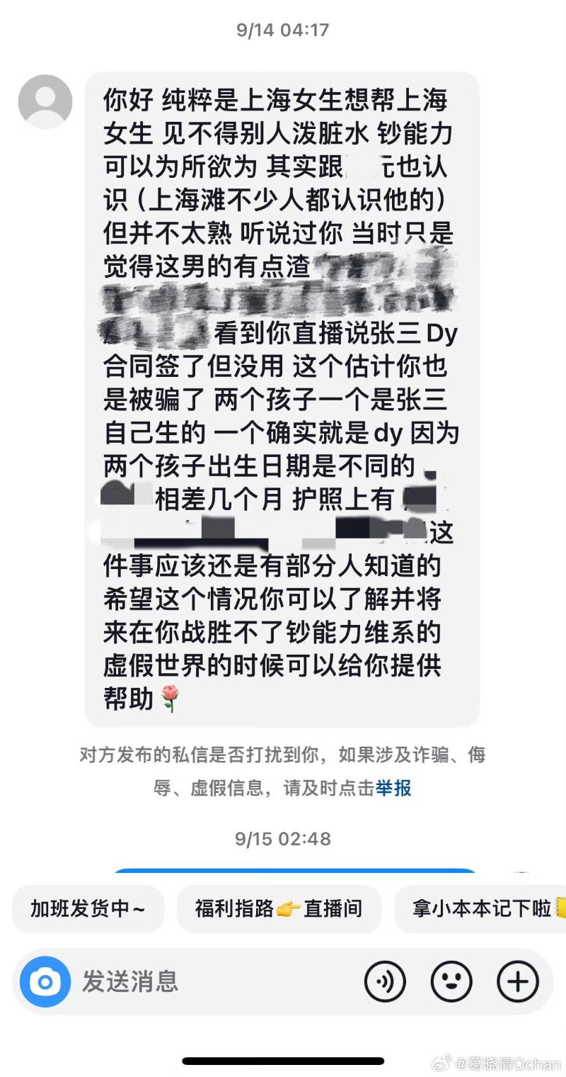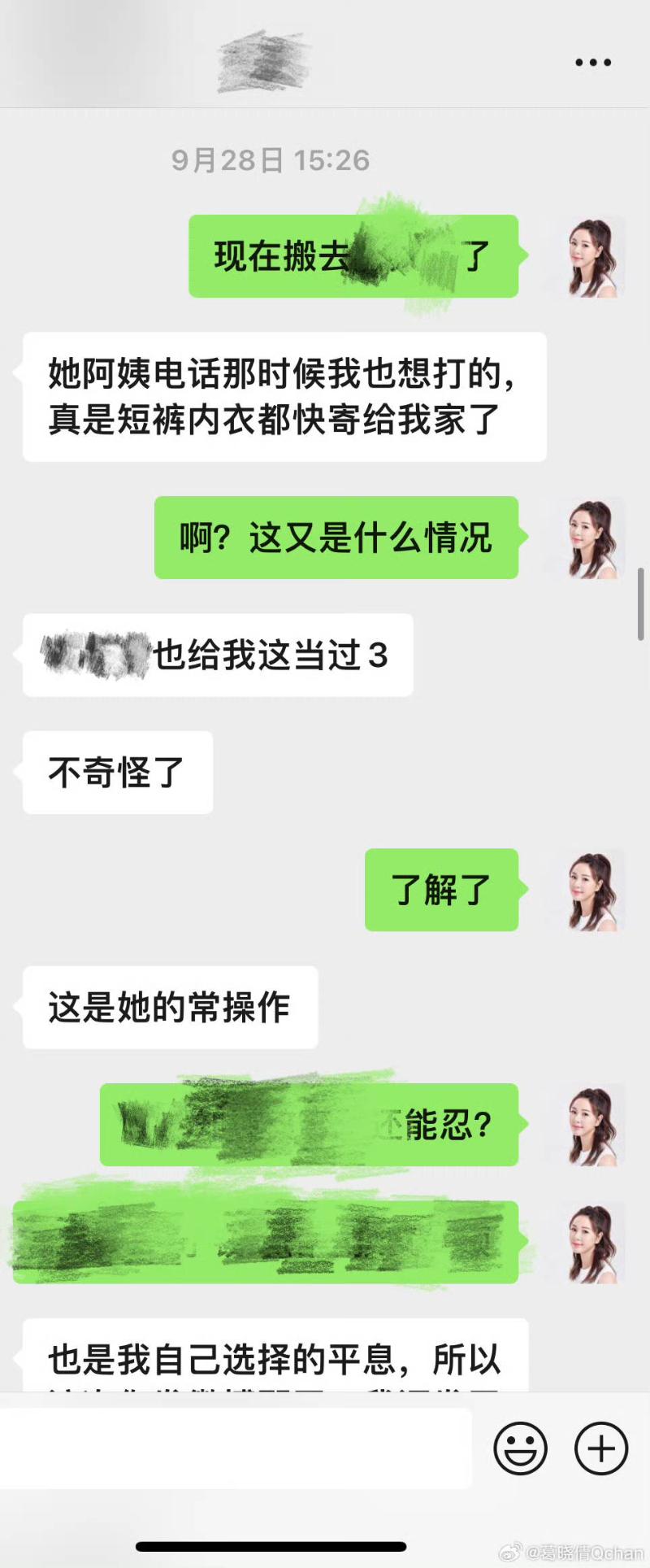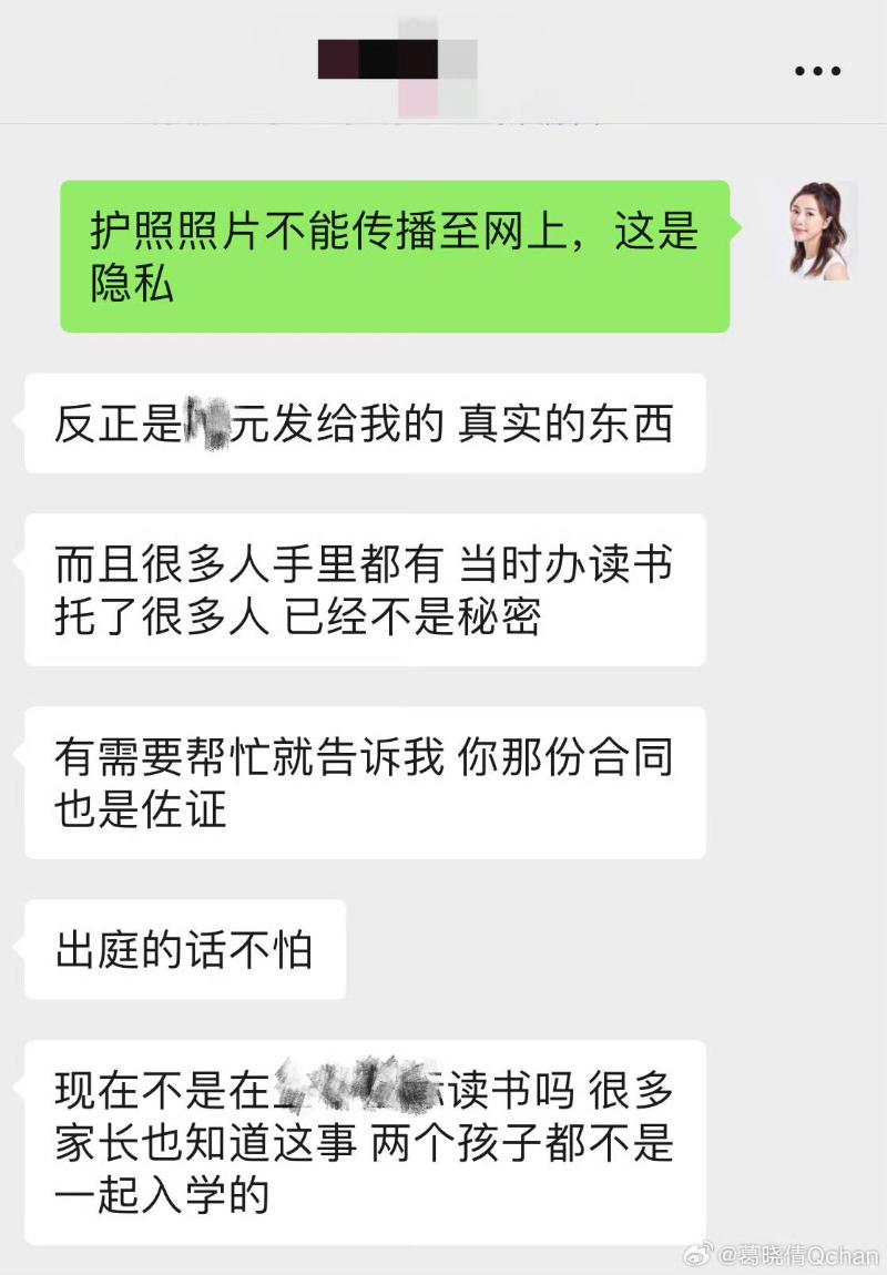 葛小倩曬出跟張雨绮前男友的女友聊天記錄,記錄顯示這位女士也是被張雨绮插足,還說某208爽子姐(張雨绮原名張爽)雙胞胎其中一個是代孕,並曬出代孕證據。