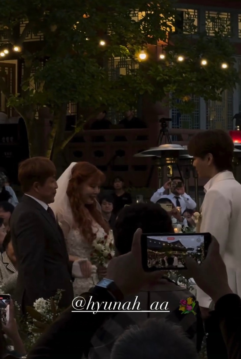 現場路透影片顯示,泫雅被長者牽著入場,隨後交給新郎倌龍俊亨手上👇