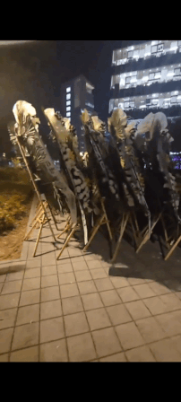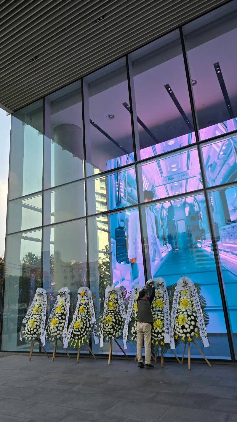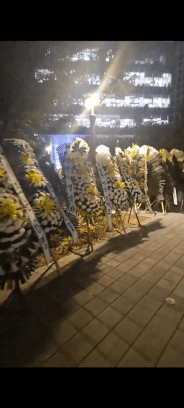 花圈數量越來越多越來越多,傍晚時分,SM娛樂大樓下面公園,已經堆滿了上千個吊唁花圈,名副其實的「花路」,只不過這條花路有點…陰森👇