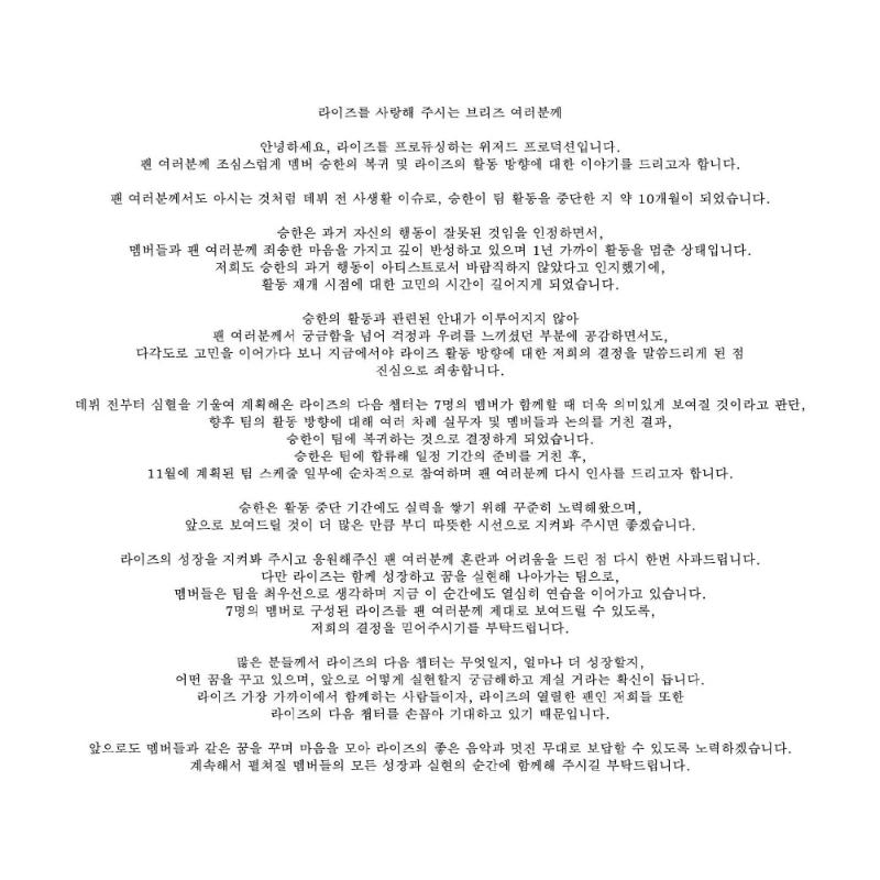 洪承漢發布手寫信,向工作人員、成員、粉絲們致歉,感謝成員們再次牽起自己的手,稱自己會用更加努力有責任感地活動。