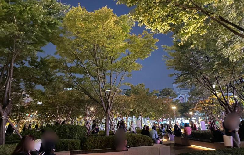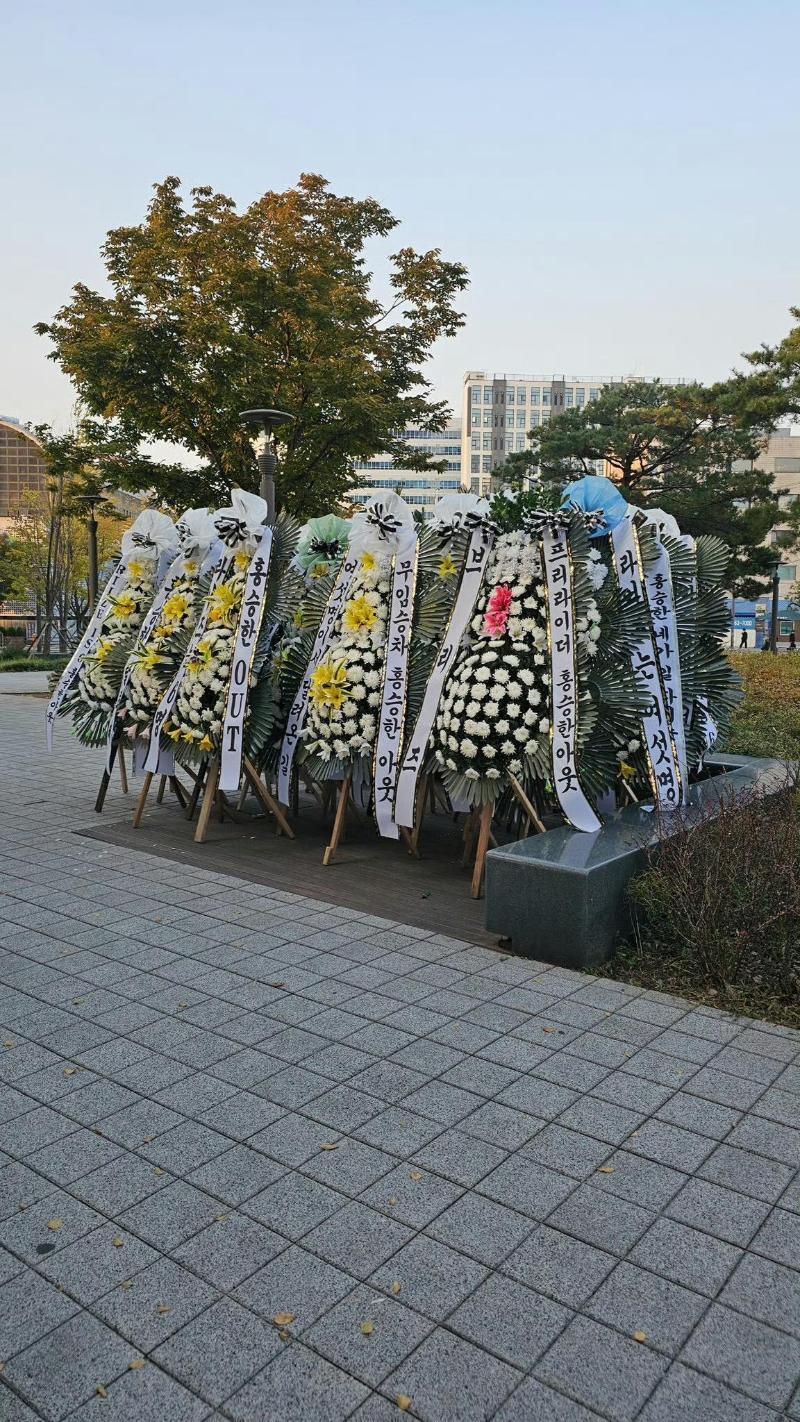 花圈數量越來越多越來越多,傍晚時分,SM娛樂大樓下面公園,已經堆滿了上千個吊唁花圈,名副其實的「花路」,只不過這條花路有點…陰森👇