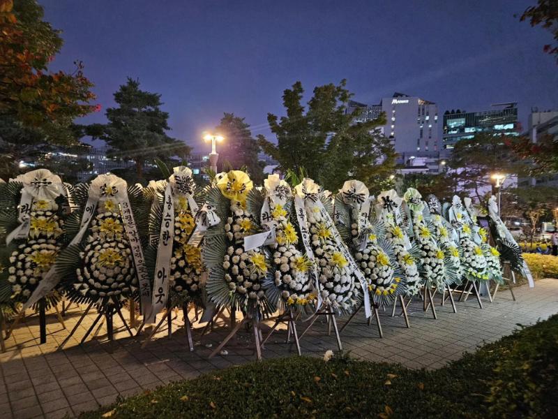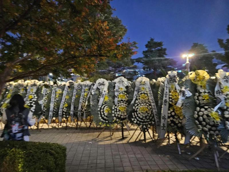 隨後,SM公司樓下開始出現抗議粉絲送來的吊唁花圈👇