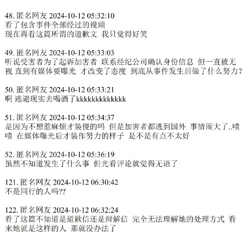 我對我這位粉絲遭受如此不公正的傷害深感抱歉,也為我沒有及時介入而感到非常自責。事發後,我和我的經紀公司一直與受害者家屬保持聯繫,正在盡一切努力幫助受害者找到筆事者,將其繩之以法,使其能夠得到應有的道歉和賠償,並追究其責任,依法懲處。