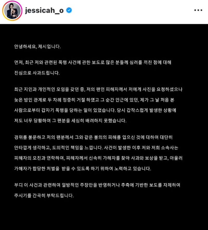 隨著新聞報道之後引起的熱議,Jessi發文表示了對該粉絲的道歉,全文如下:
