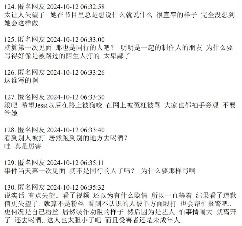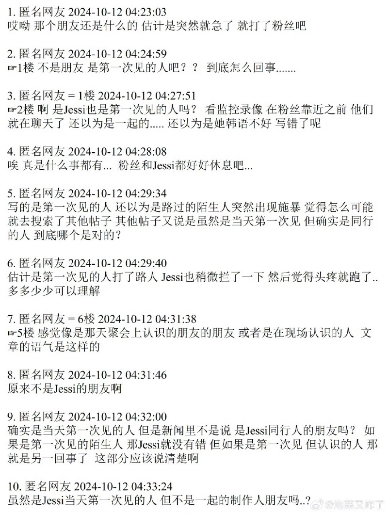 受害者解釋說,毆打是突然發生的,他被嚇壞了,根本沒有機會躲避攻擊。他還補充說,Jessi最初似乎想阻止暴力,但最終還是離開了現場。這位粉絲表示,「人被打了卻沒有採取措施,可能是怕被牽連Jessi離開了現場,對Jessi的態度感到失望」。