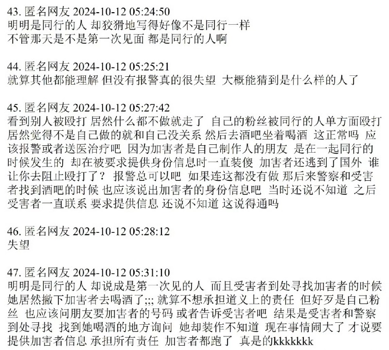 我對我這位粉絲遭受如此不公正的傷害深感抱歉,也為我沒有及時介入而感到非常自責。事發後,我和我的經紀公司一直與受害者家屬保持聯繫,正在盡一切努力幫助受害者找到筆事者,將其繩之以法,使其能夠得到應有的道歉和賠償,並追究其責任,依法懲處。