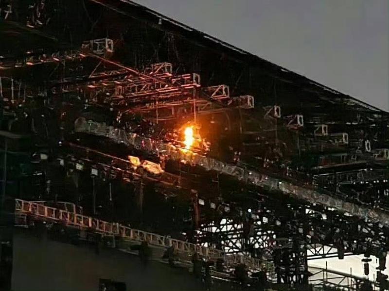 沒錯,先來看看,在舞台上方居然著火了,據悉是煙火效果導致而成!