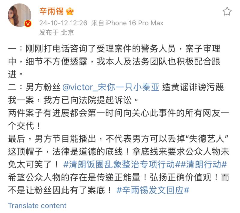 12號下午,前女友辛雨錫再次發文喊話,表示“失德藝人”如果還能繼續工作,真的太可笑了👇
