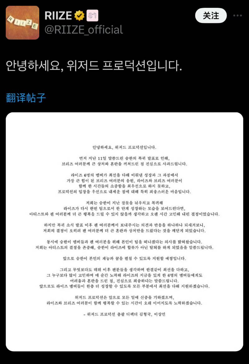 而SM也官宣撤回讓洪承漢復出的決定,並在官宣文中寫道:「我們尊重洪承漢的決定,現宣布洪承漢將從RIIZE退出,而非復出。以後我們將繼續支持洪承漢展現自己的才能實現夢想。」