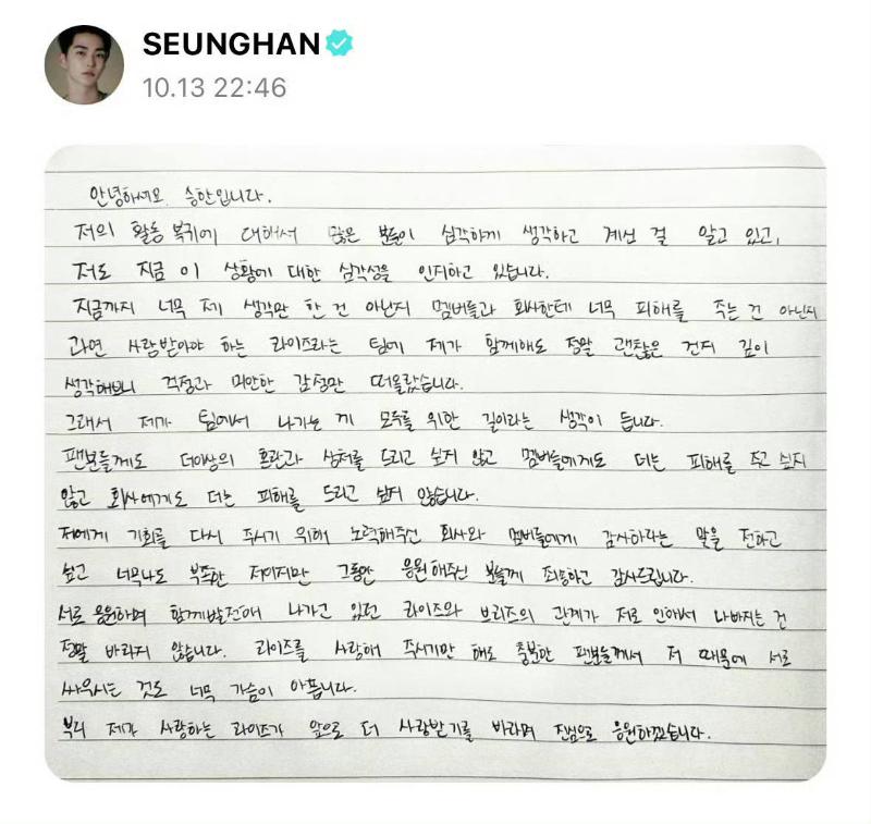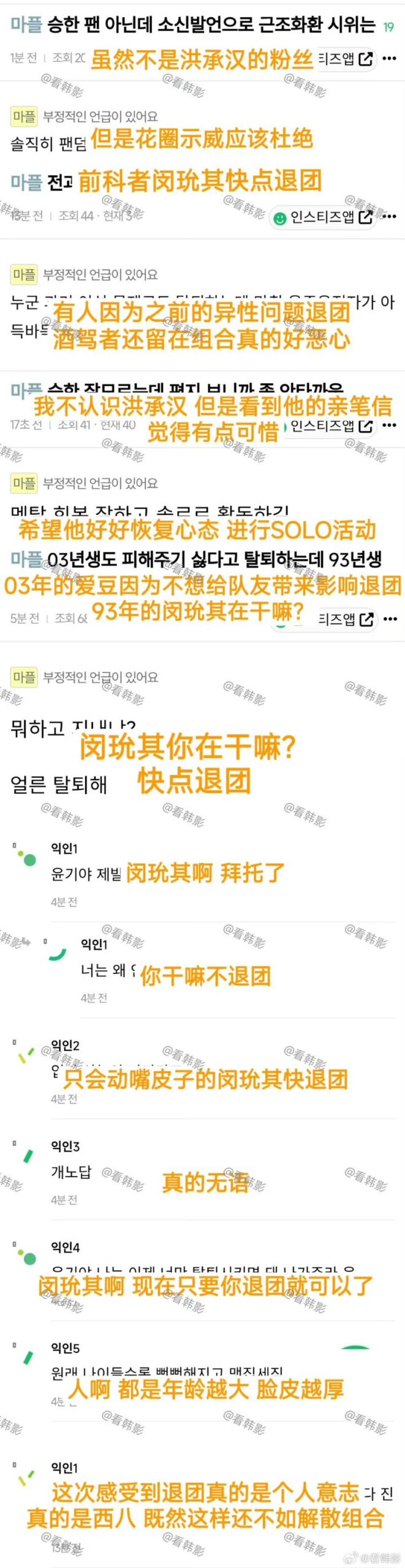 隨著粉絲預告即將在週一、週二引發更大規模的抗議,洪承漢在13號深夜發文,表示為了成員及粉絲,決定離開團隊👇