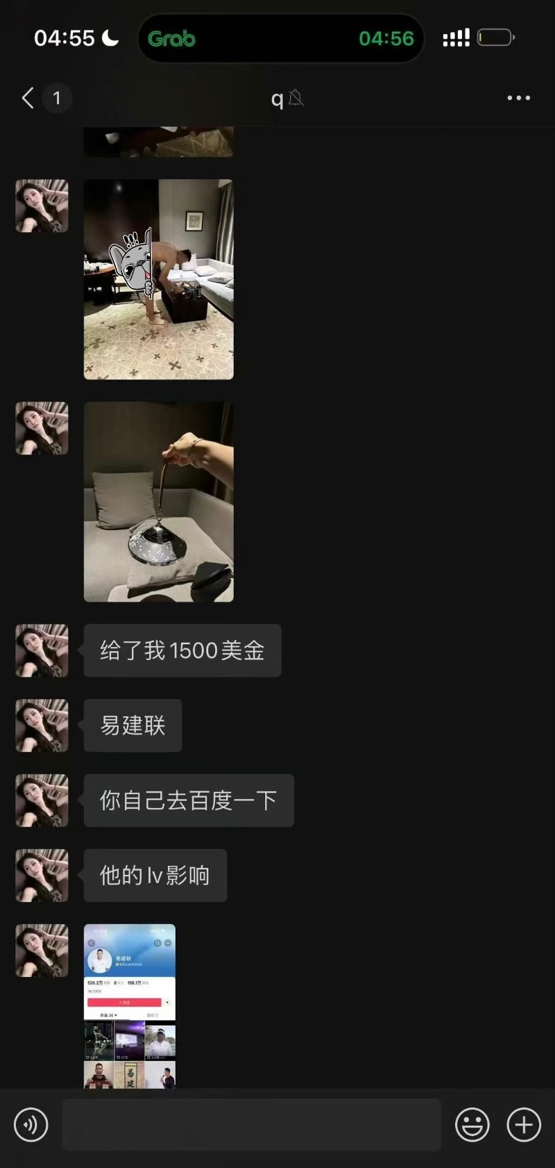 來看看,傳聞的起源是這位跨性別者發微信炫耀,表示收到了1500元服務了易建聯,並附上了他的身分證,還有裸體照👇