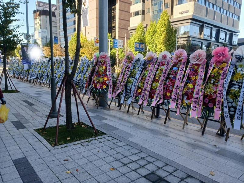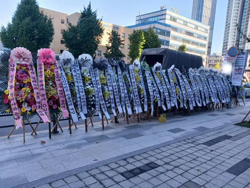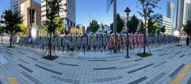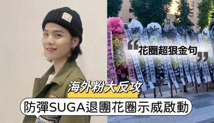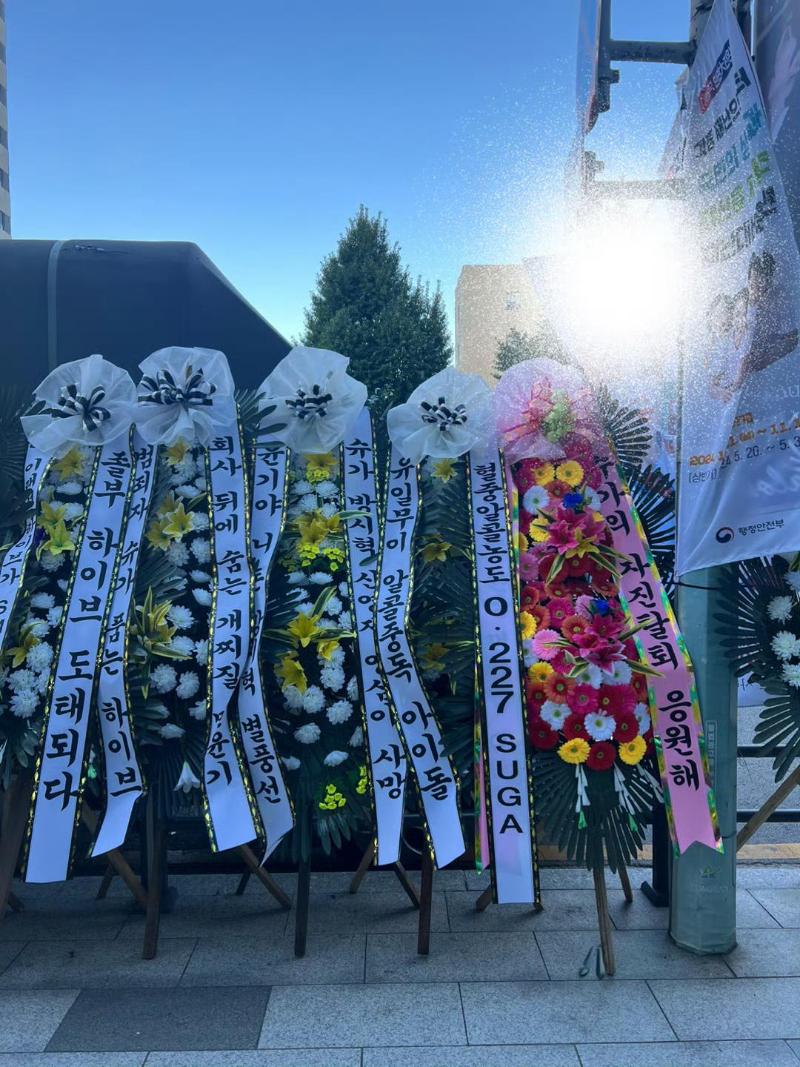 而在20號這天,SUGA退團花圈示威正式開跑,HYBE公司樓下擺滿了要求SUGA退團的花圈!