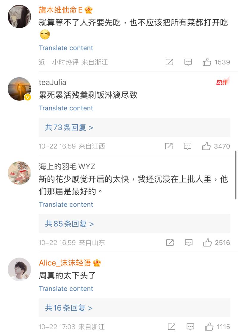 到底怎麼一回事呢?原來是當其他成員不在酒店時,這四個成員在周雨彤號召下,率先打開吃了9個人的飯菜👇