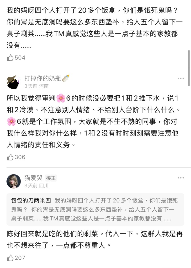 沒有等其他人就算了,甚至沒留下「乾淨」的飯菜,吃完也不把蓋子蓋上,這樣的舉動引發網友怒氣,覺得這不是沒有團隊精神,已經是沒教養的程度了👇