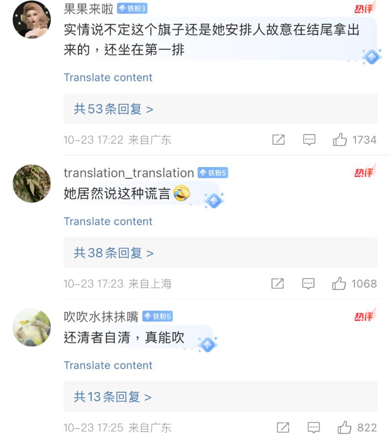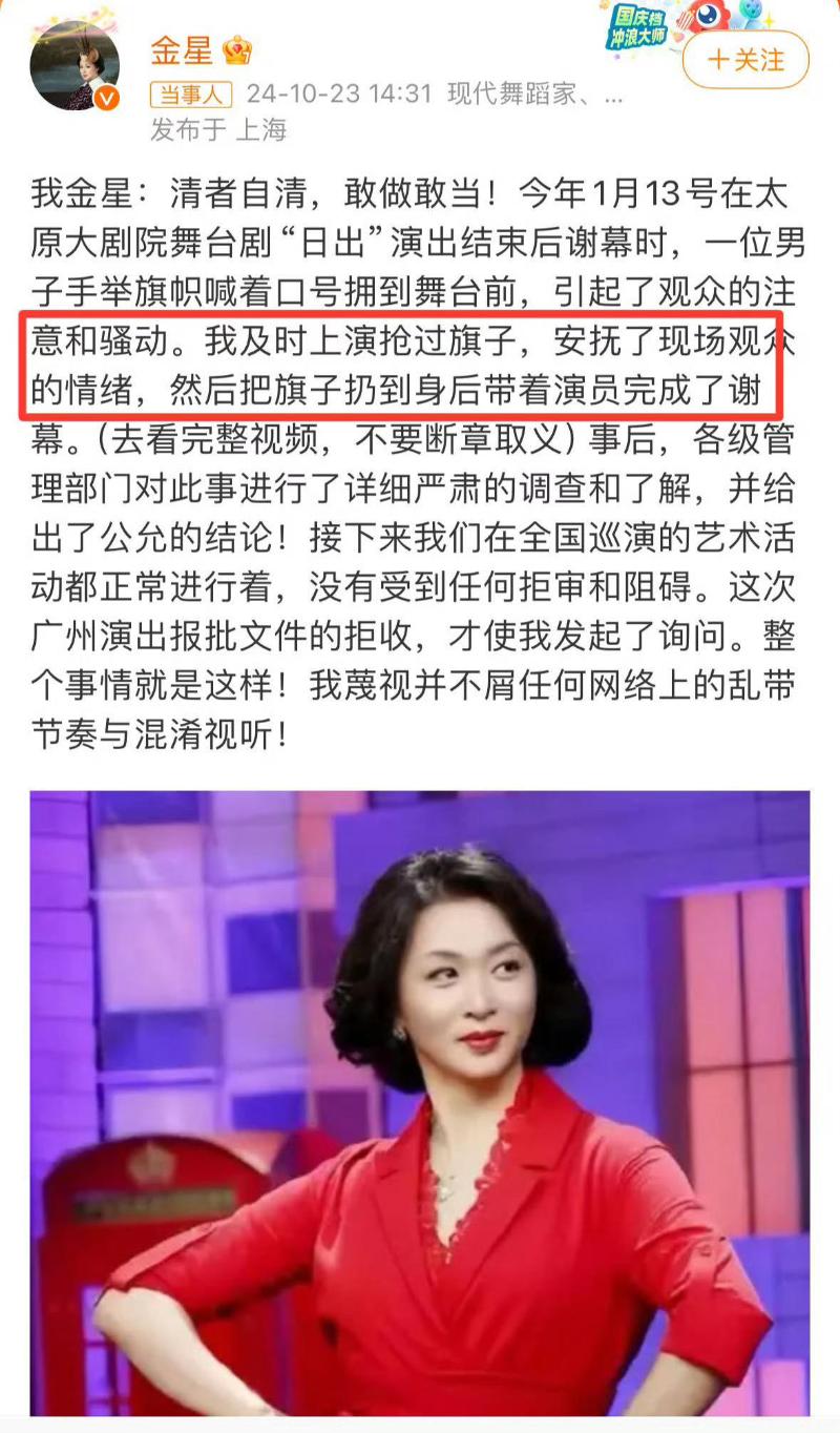 隨著熱議,金星再發文喊話,表示自己「清者自清,敢作敢當!」她表示之所以會在謝幕時高舉彩虹旗,是因為有男子在現場舉旗幟擠到舞台前,引起了現場觀眾的注意和騷動。而自己「及時上演搶過旗子,安撫現場觀眾的情緒,然後把旗子扔到身後帶著演員完成了謝幕」金星也在文中強調,讓網友去看完整視頻,不要斷章取義!