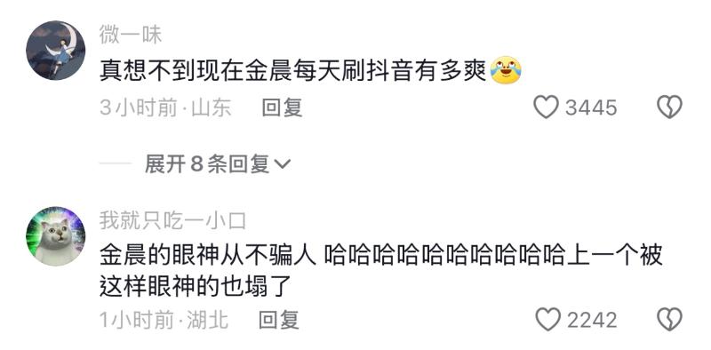 最後,也來看看金晨如何再現眼神名場面!提到金晨的眼神,都知道她曾在節目中和張繼科約會,當時本來很開心的金晨,聽見張繼科叫自己「晨晨」之後,一秒「眼神死」!這眼神在張繼科塌房之後,直接成了名場面表情包👇