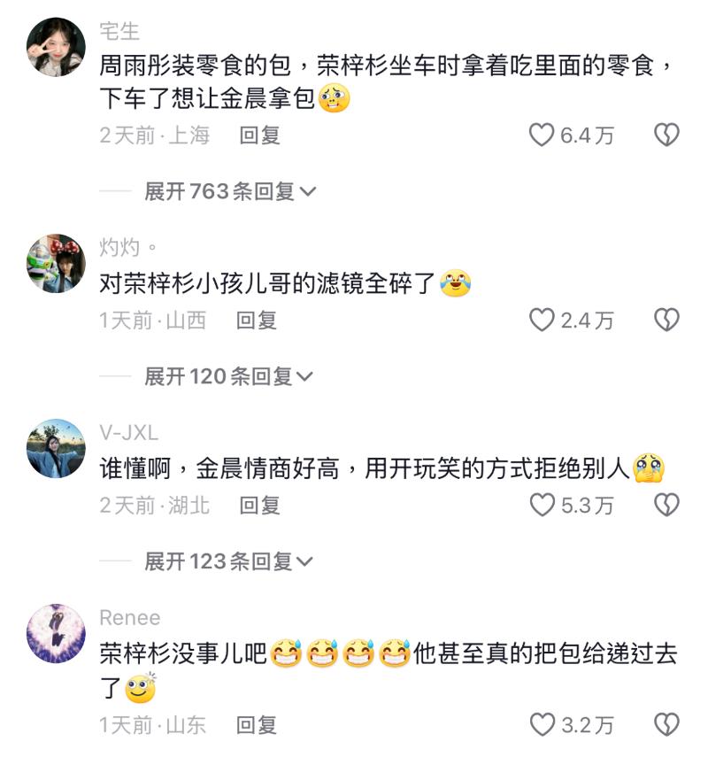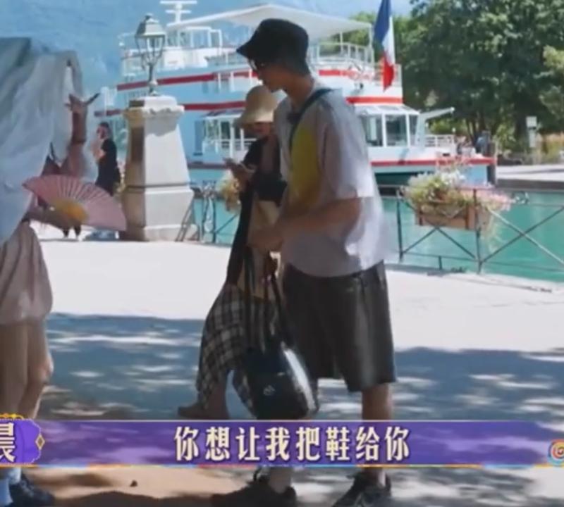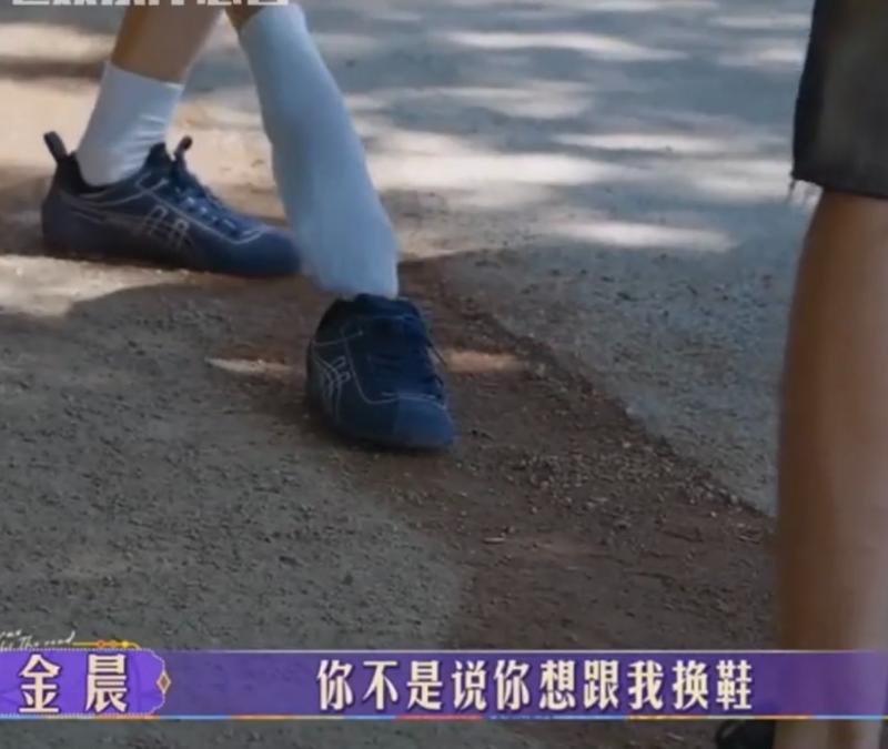 另一個名場面,則是金晨回應榮梓杉的要求,當時榮梓杉想讓金晨幫忙拿裝了自己零食的包包,就表示包包和金晨的鞋子很搭~