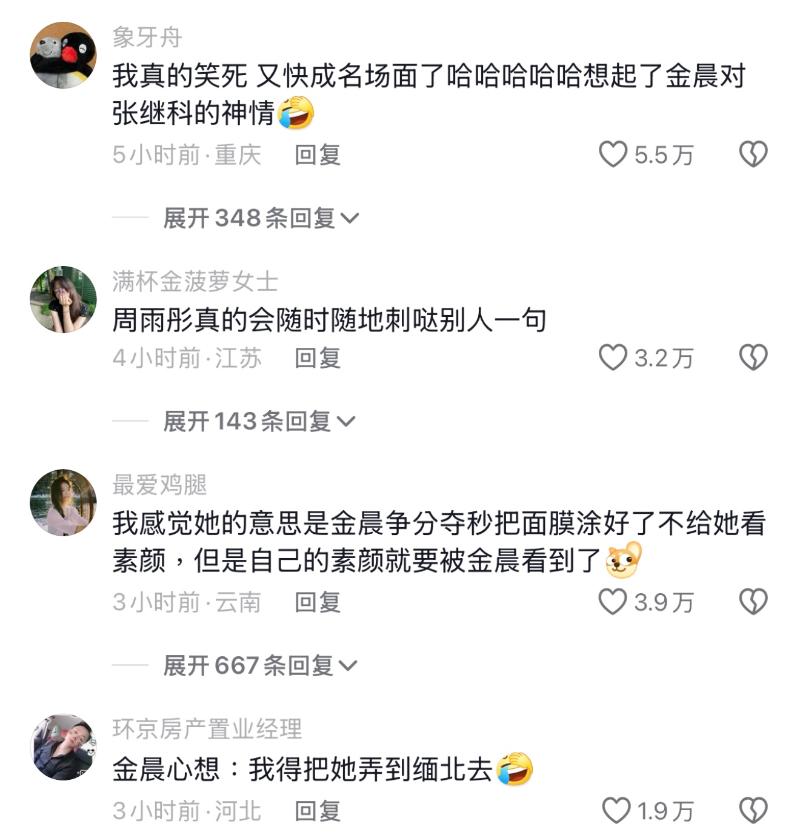 沒想到這次在花少6中,又有幸看見金晨重現這種眼神~當時周雨彤看見金晨卸妝,表示自己也要卸,之後還追加了一句:「你倒挺爭分奪秒!」