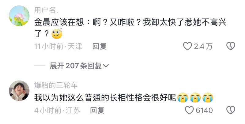 最後,也來看看金晨如何再現眼神名場面!提到金晨的眼神,都知道她曾在節目中和張繼科約會,當時本來很開心的金晨,聽見張繼科叫自己「晨晨」之後,一秒「眼神死」!這眼神在張繼科塌房之後,直接成了名場面表情包👇