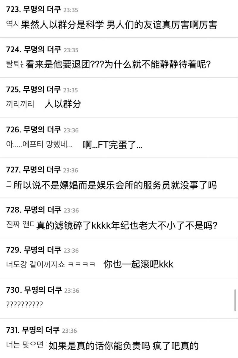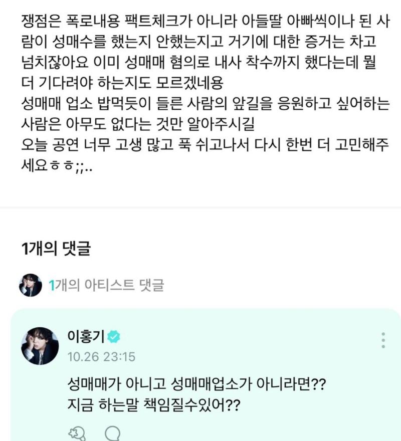 「爭議點不是對爆料內容的事實確認,而是身為一個有兒子女兒的父親的人是否進行了性交易,且性交易相關的證據不是很多了嗎,都已經因為性交易嫌疑開始內部調查了,真不知道還要等什麼呢。請知道一點,沒有人會應援一個像吃飯一樣進入會所的人的未來。今天的演出真的辛苦了,請好好休息後再想想。」
