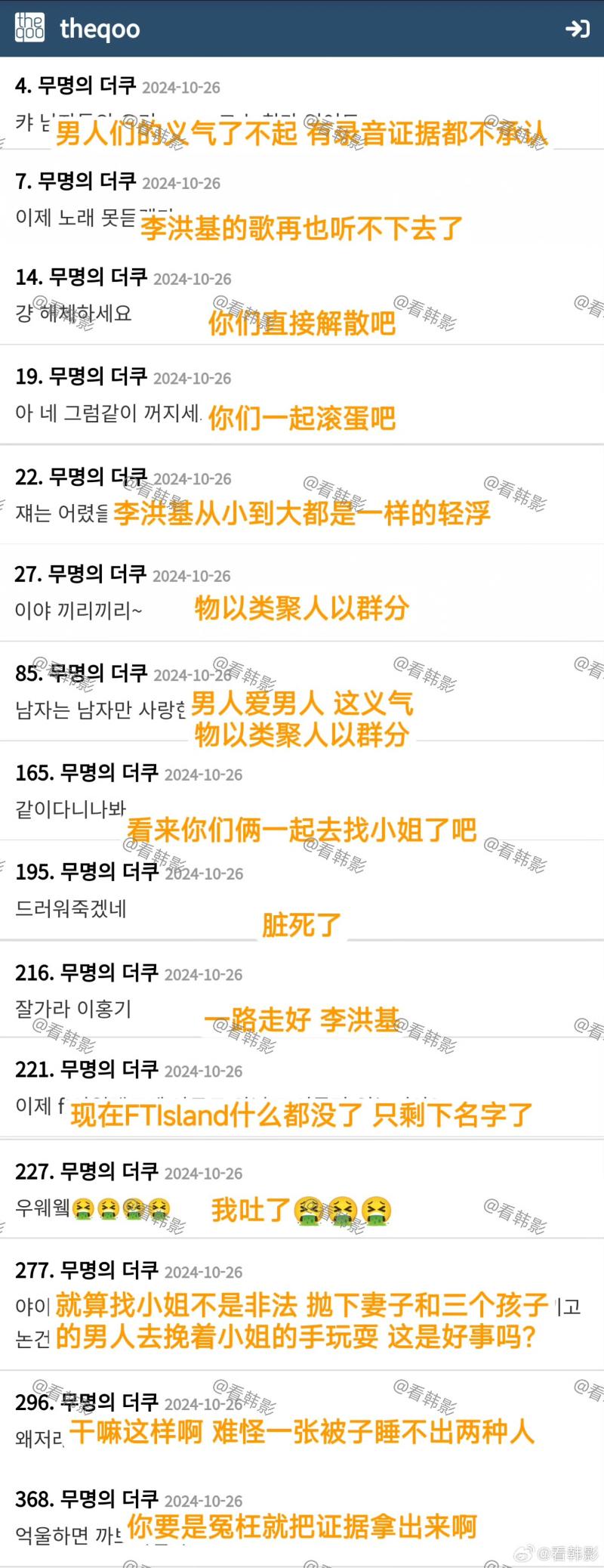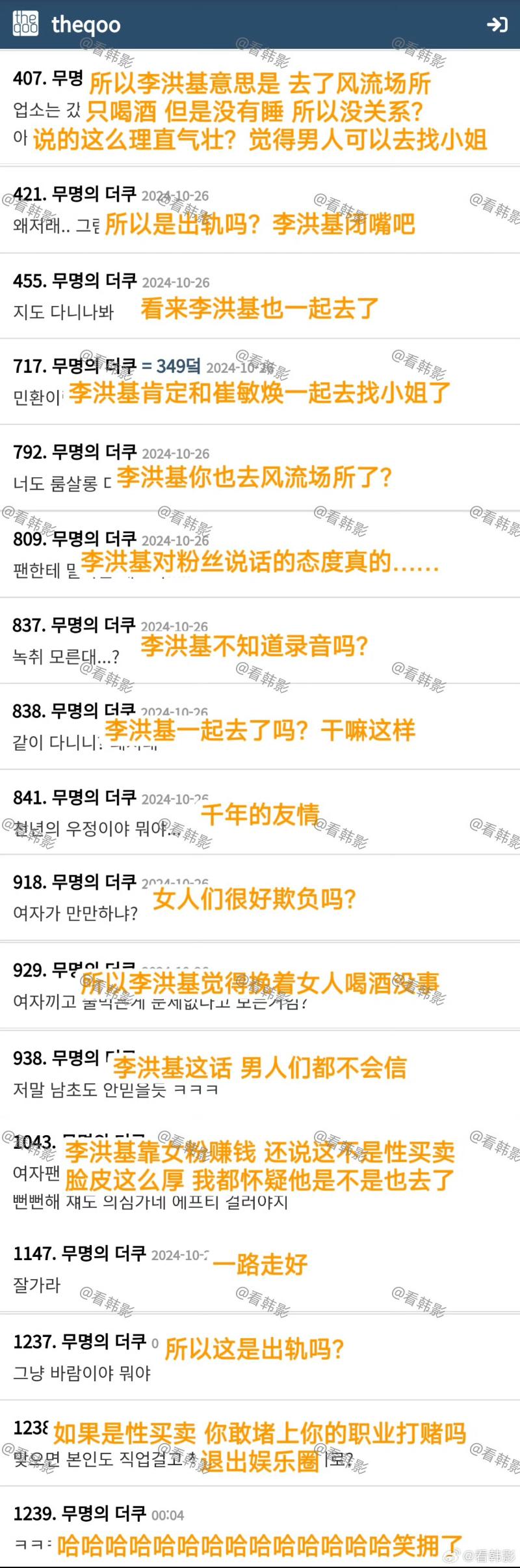 對話曝光之後,迅速在韓網引發熱議,韓網友炮轟李洪基和崔敏煥物以類聚,喊話兩人一起退出娛樂圈👇