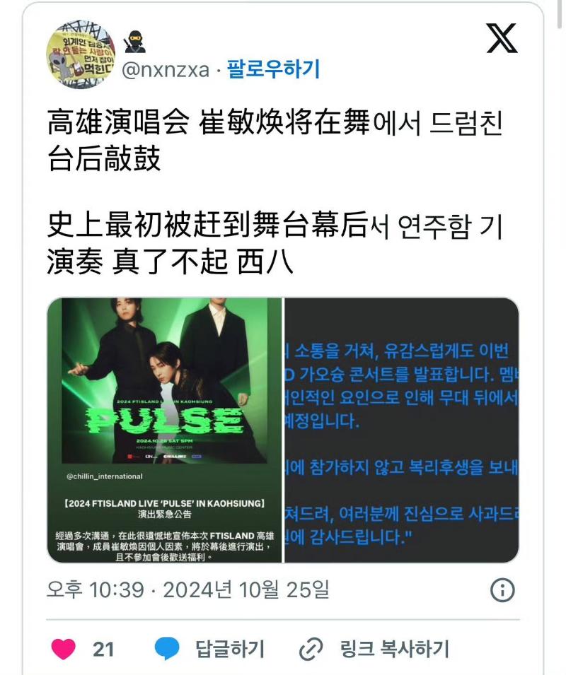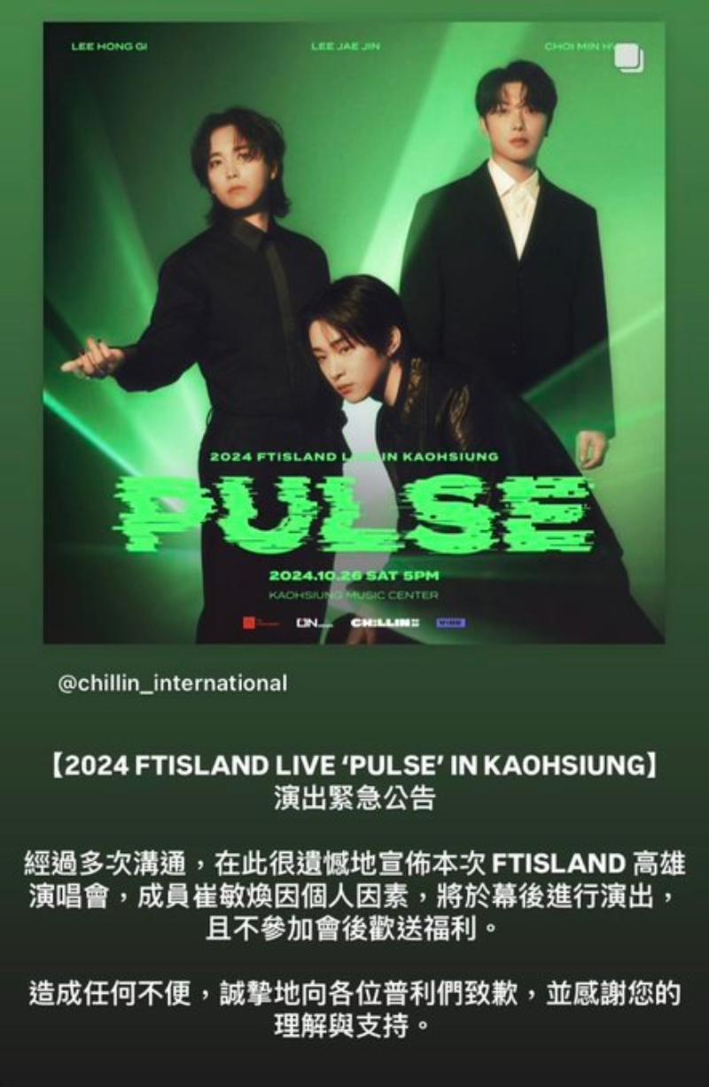 沒想到相關爭議還有後續!F.T.Island剛在26號晚結束了在台灣的巡演,雖然經紀公司表示將崔敏煥將暫時中斷活動,但由於事發太突然,因此他還是參與了台灣巡演,只不過是在後台以不露面形式出演👇