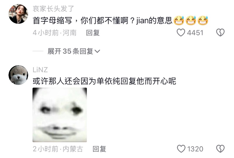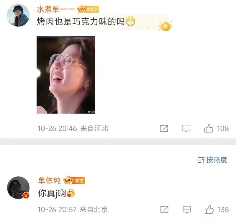 就有粉絲留言:「烤肉也是巧克力味的嗎?」並配上了單依純雙下巴的圖,沒想到單依純直接回應:「你真j啊!」這裡的「j」,普遍上被網友認定是「賤」的拼音「jian」的首個字母👇