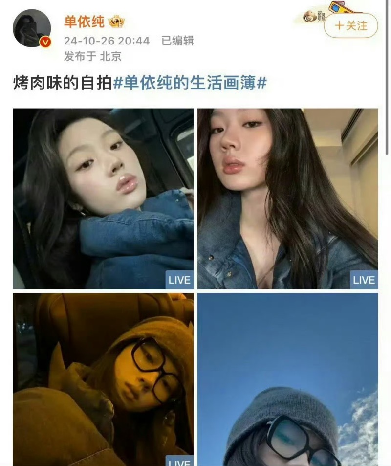 隨後單依純曬出了生活自拍,配文是「烤肉味的自拍」👇