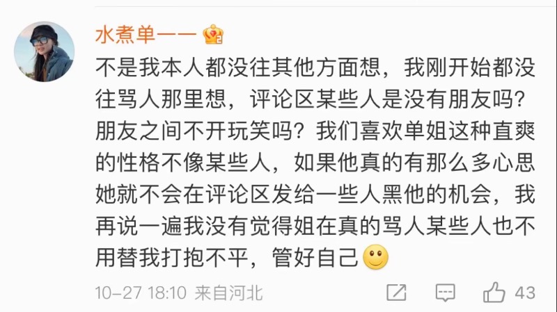 而被評論的粉絲也回應,表示這很明顯就是單依純和自己開玩笑,希望不要被惡意解讀!